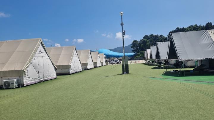 고성잔디 캠핑장은 고성 읍내와 군립공원의 중간지점에 위치하고 있는, 폐교를 개조하여 만든 캠핑장이다. 넓은 사이트로 여유롭게 텐트를 칠 수 있어 좋은 캠핑장은 40여개의 사이트를 가지고 있다. 다른 캠핑장과는 다르게 이곳 데크 사이트는 지면과의 높이를 있게 하여 밑에서 올라오는 습기를 막아주고 있다. 아이들이 마음 놓고 뛰어놀 수 있게 잔디로 되어 있는 운동장과 길 안쪽으로 나있는 인라인 등 킥보드를 탈 수 있도록 만들어 놓은 길은 얼마나 아이들을 위한 캠핑장인지를 알 수 있다. 아이들의 놀이기구인 트램펄린이 2군데로 나누어져 있어 안전하게 기다림 없이 즐길 수 있어 좋다. 실내에는 도서관, 실내놀이터, 영화상영관이 있어 주말이면 영화상영도 한다. 여름에는 수위조절을 한 수영장도 2군데로 나누어져 있다. 밤이 되면 하늘에 은하수가 펼쳐져 있어 도심에서는 많이 보지 못하는 수많은 별들의 향연을 관찰할 수 있다. 이외에도 캠핑장 한편으로 텃밭에는 상추 파 깻잎 고추 등의 채소가 자라고 있어 마음껏 따 먹으면 된다. 매주 금, 토요일 에는 자체방역을 실시하고 있다.