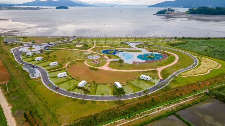 남해의 힐링아일랜드 글램핑장은 숲, 바다가 있는 천혜의 자연환경을 가지고 있는 대자연이 주는 종합선물을 받은 캠핑장이다. 캠핑장은 17개의 글램핑과 펜션으로 구성되어 있으며, 글램핑 내부에는 침대, TV, 냉장고, 와이파이, 세면도구, 취사도구, 식탁, 의자, 에어컨, 드라이기, 싱크대, 가스버너, 옷걸이, 밥솥, 수건 등이 있다. 글램핑 내에 화장실 겸 샤워장이 설치되어 있어 편리하게 생활할 수 있다. 하우스형 전용 타프가 설치되어 있어 비나 눈이 와도 식사가 가능하며 바비큐 시설도 설치되어 있다. 캠핑장 한쪽에는 잔디 운동장이 있어 아이들이 뛰어 놀기에 좋으며, 토끼, 닭 등이 있는 미니 동물농장이 있어 자연학습장으로도 좋다. 실내에는 놀이시설이 잘 되어 있는 키즈존과 미니도서실이 있어 아이들이 심심해할 겨를이 없다. 캠핑장 앞으로 갯벌이 있어 갯벌체험과 낚시체험도할 수 있다. 여름이면 어른들을 위한 야외 대형수영장과 유아전용 수영장이 따로 나누어져 있어 안전하게물놀이를 할 수 있으며, 토요일 밤에는 버스킹 공연과 노래자랑 경연도 있어 온 가족이 모여 앉아 즐거운 시간을 보낼 수 있다.